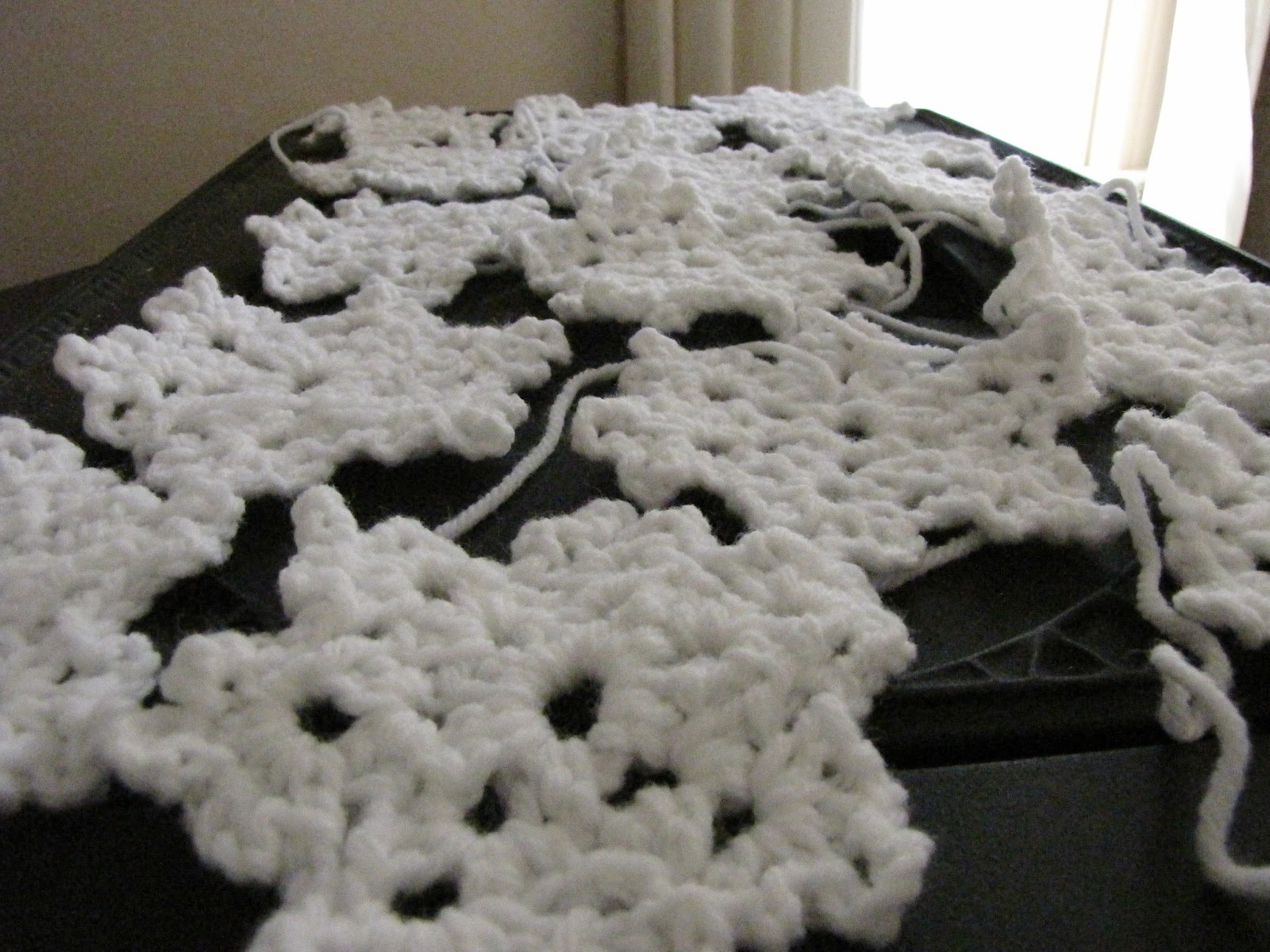 I'm making handfuls of these cute crochet snowflakes. You can find a wonderful tutorial here. I'm using whatever white yarn I have in stash, these pictures are aran weight acrylic. I'm also using a much thinner alpaca and a smaller hook.